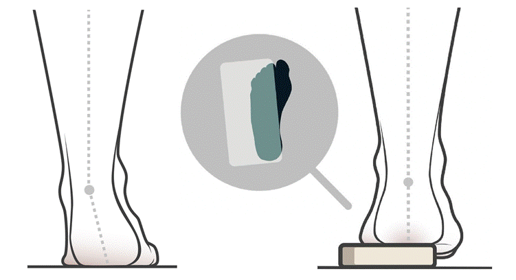 Kuva 3. Coleman Block- testi. Vasemmalla jalan etuosan valguksesta johtuvan kaarijalka, jossa nähdään kuormitettuna vasemman jalan kantaluun varus. Coleman Block- testissä lauta asetetaan jalan alle niin, että I-säteen päkiä ja isovarvas ei ole laudan päällä. Joustavassa jalan etuosan valguksesta johtuvassa kaarijalassa kantaluun asento suoristuu testissä. Havainnollistamisen helpottamiseksi kuvien välistä asennon muutosta on korostettu.