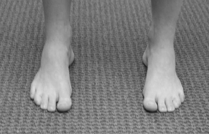 Kuva 2. Peek-a-boo heel sing- testissä kuntoutuja seisoo jalat eteenpäin osoittaen ja jalkoja inspektoidaan kuntoutujan edestä. Testin katsotaan olevaan positiivinen, mikäli kantapään rasvapatjaa pystytään näkemään mediaalisesti. Muun tyyppisessä jalassa kantapään aluetta ei pystytä näkemään samalla tavalla kantaluun valguksen vuoksi. (3.)