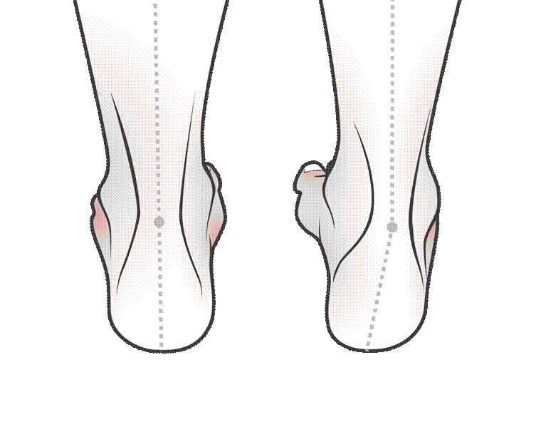 Kuva 1. Kuvan vasemman jalan kantapää on suora ja oikealla takaa katsottaessa kantaluu on varuksessa. Kuvasta näkyy myös jalkaterän adduktio. Asiantuntija-arvioiden perusteella pes cavuksen hoidon tavoitteena on puuttua lihasepätasapainoon sekä asentopoikkeamiin ennen kantaluun varus- asennon ilmentymistä. Asentoon pystynee vaikuttamaan paremmin konservatiivisin ja operatiivisin menetelmin ennen kuin kantaluun varus- asento on rigidi.