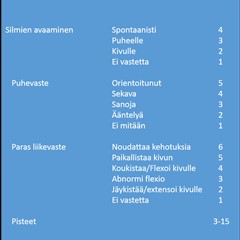 Apuna aivotärähdyksen arviointiin kannattaa käyttää myös suomenkielelle käännettyä SCAT5-työkalua, jossa on myös välittömän kenttäarvioinnin ohjeet. Koko SCAT5-kyselyn suorittaminen asianmukaisesti vie kuitenkin +10min.
