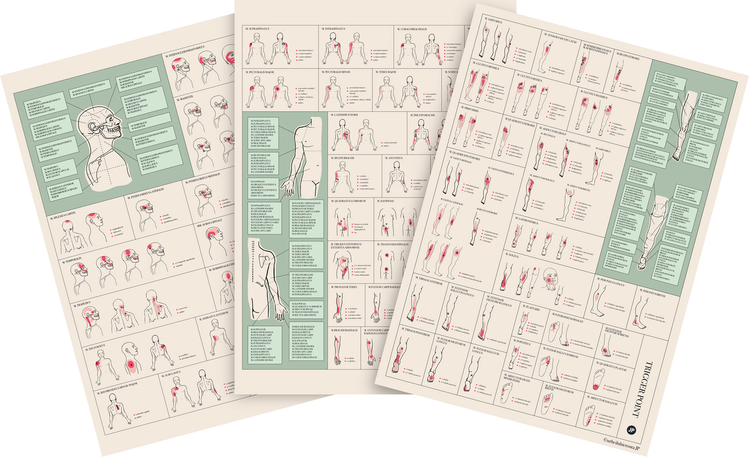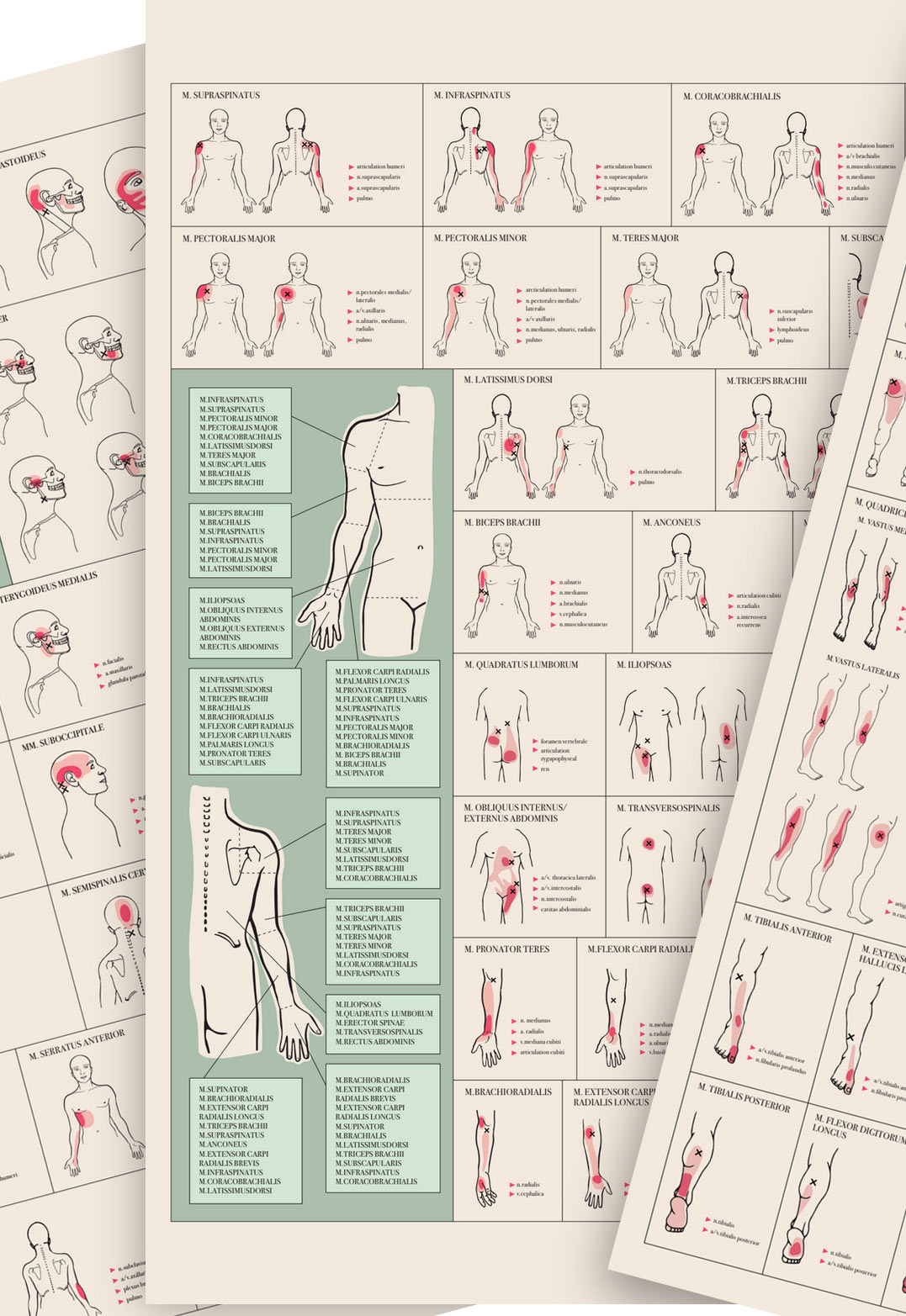 3 triggerpistekarttaa, joiden avulla löydät nopeasti tiedon sekä ylä- ja alavartalon triggerpisteiden sijainnista ja niiden heijastealueesta. Erinomainen työväline manuaalisen terapian ammattilaisille.